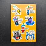 A 4" x 6" sticker sheet of a critters at a convention