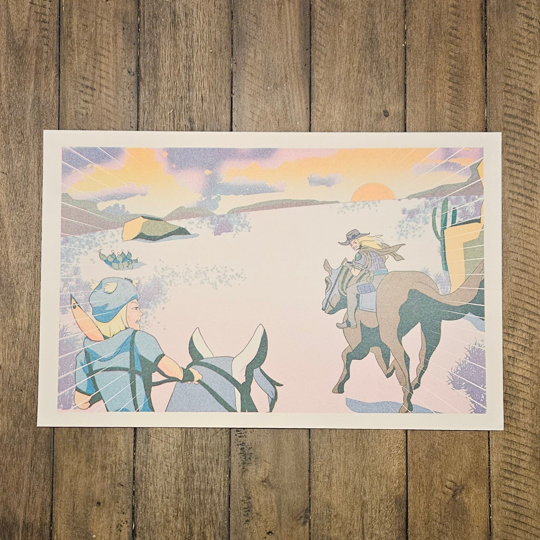 An 11x17 Riso Print of Two cowboys riding off into the sun.